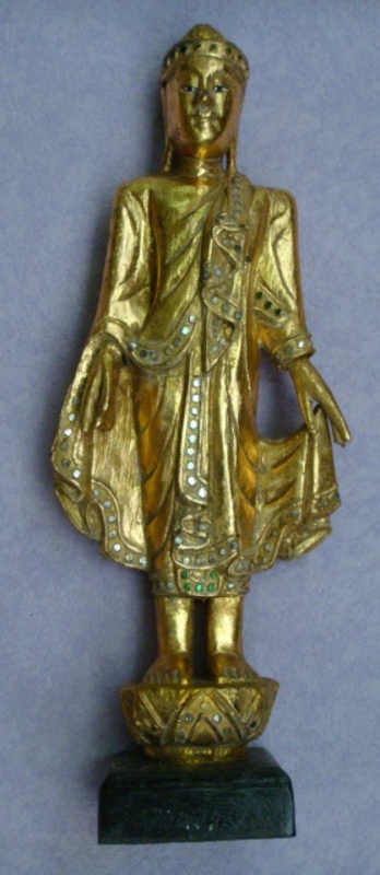 en teak, décoré avec des bouddhas différents en terra cotta et un bouddha doré en teak, 40x12x18 cm